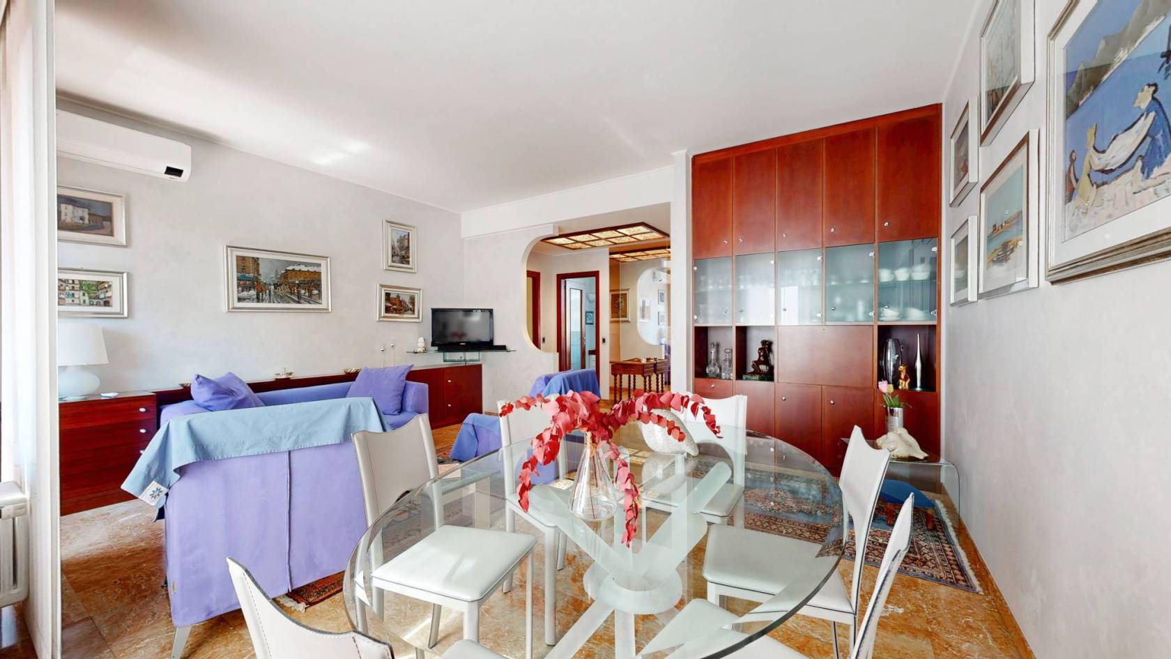 Completa l'unità abitativa un balcone ed un terrazzino, entrambi ideali per apprezzare la vista panoramica. La doppia esposizione assicura una luminosità naturale durante tutto il giorno, mentre l'aria condizionata mantiene un clima perfetto in ogni stagione. Inclusi nel prezzo ci sono anche una cantina e un box auto, rendendo questo appartamento ancora più comodo.
